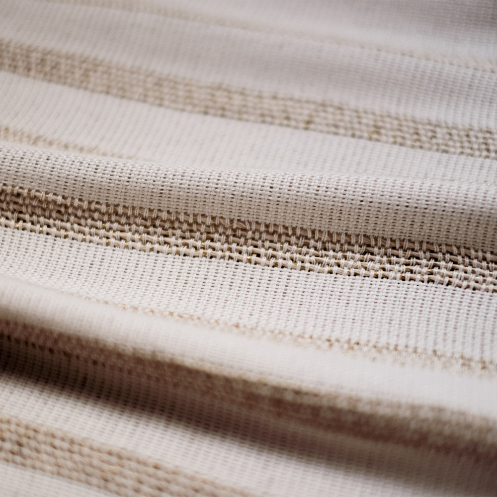 The regular sections of hemp twine, carefully plied with a gold metallic yarn, add a touch of ruggedness and texture to the fabric, while the gold metallic yarn catches the light and shimmers with a soft, sun-kissed glow. Like the veins that nourish and support the tender tissue of a leaf, this fabric combines delicate and substantial elements in a masterful blend of texture and design.